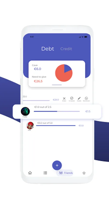 • Debt manager that lets you add credit and debit friends along with financial resources