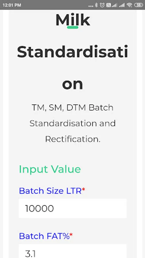 You have to enter Batch size (in litre), Batch Fat% and SNF% (Indian Legal standard Fat%=6.0, SNF=9.0%)