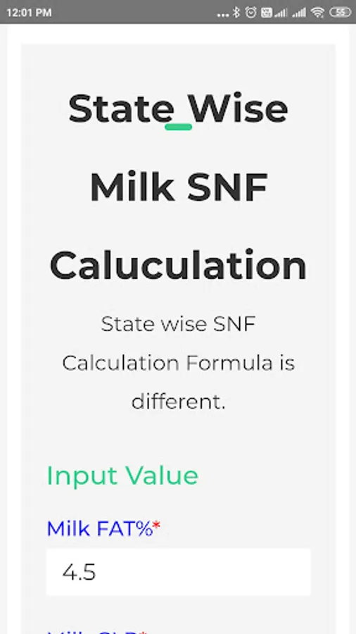 Dairy Calculation website / Mobile App is a straight forward solution of staffs or workers associated with dairy industry. Its a dairy or milk calculator app for common people also. In this website we have presented tables or forms for “Input Value” as well as for required value or “Output Value”. Output Value will change automatically when Input Value will be changed. Links of each table/form given to Home Page or Main page of website / Mobile App. You may shifted to main page from calculation table/form page. Legal standard value (FSSAI – Food Safety Standard Authority of India) has been taken as predefined value in most of calculation tables. But anybody can use calculation tables to calculate as per their needs or legal requirements.