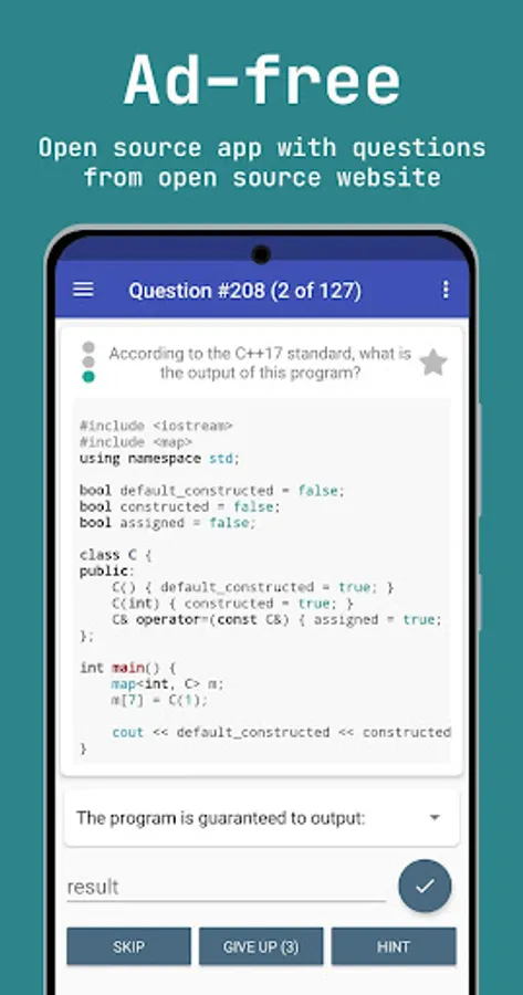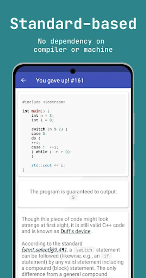 If you’re unfamiliar with it, you can read more in its “About” section (http://cppquiz.org/quiz/about/)