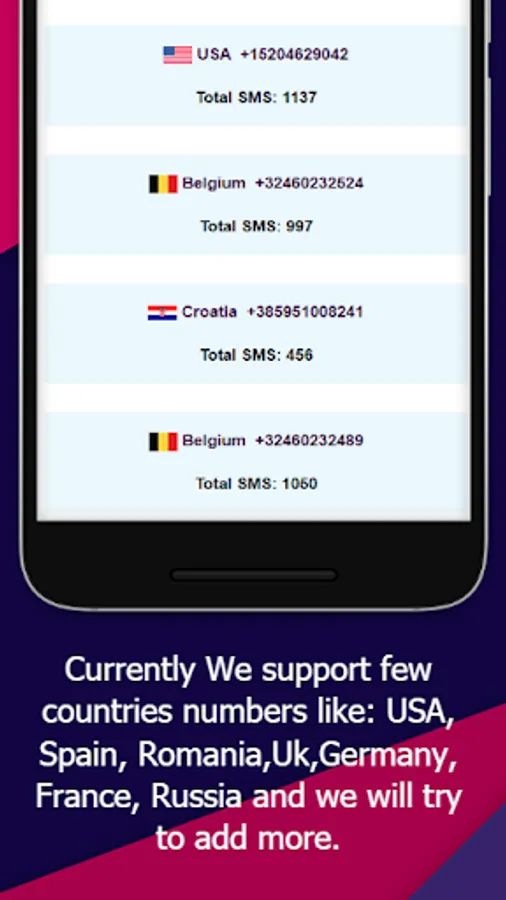 Currently We support few countries numbers like: USA, Spain, Romania,Uk,Germany, France, Russia and we will try to add more.