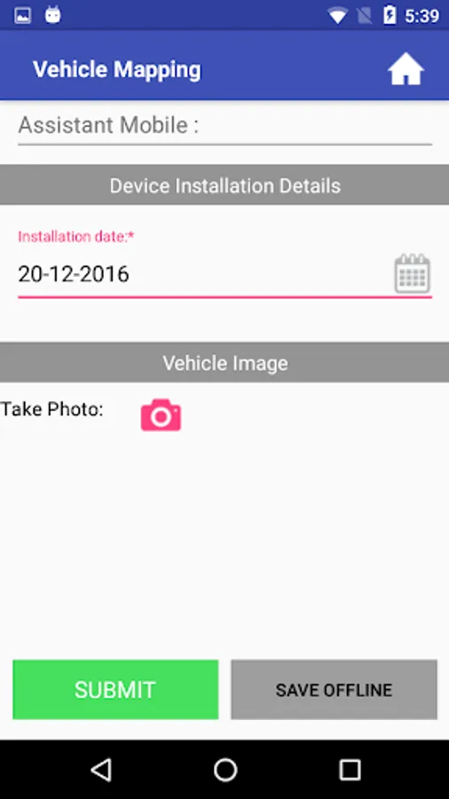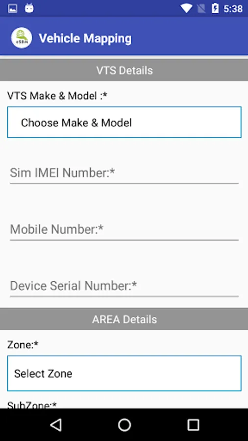 This application facilitates capturing of the Vehicle details (registration number, fuel type, fuel economy), VTS device (make, model and serial no), SIM details (IMSI and mobile no) and associated Driver and Helper contact details.