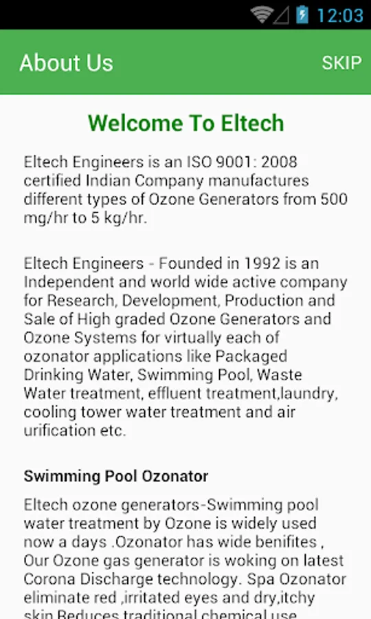Eltech Engineers - Founded in 1992 is an Independent and world wide active company for Research, Development, Production and Sale of High graded Ozone Generators and Ozone Systems for virtually each of ozonator applications like Packaged Drinking Water, Swimming Pool, Waste Water treatment, effluent treatment,laundry,cooling tower water treatment and air purification etc.