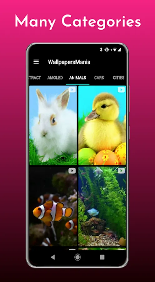 Available categories: Anime, Animals, Cars, Cities, animated GIF wallpapers, Girls, ultra black wallpapers for AMOLED, Nature and Flowers, Holidays and more.