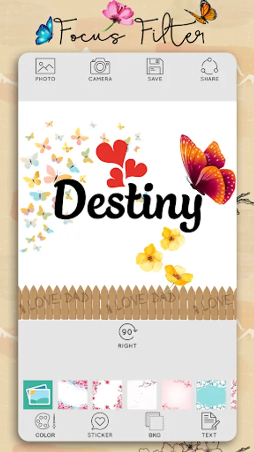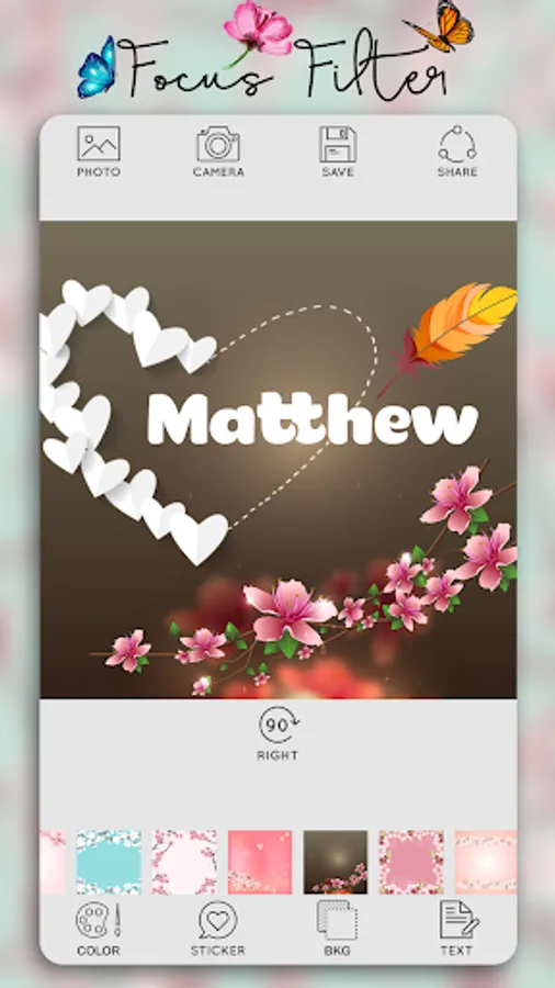 Create awesome, amazing and beautiful love card with Name Art - Focus n Filter. With this app you can decorate and stylize any text you write such as your name, your dear name, your mother name, father name, friend name, your nick name,... With text you can choose your love font, color, edit size text, drag, rotate your text. After that you can decorate it with different decorative item as feathers, love items, art item, love stickers, color brush, color filter, heart shapes.