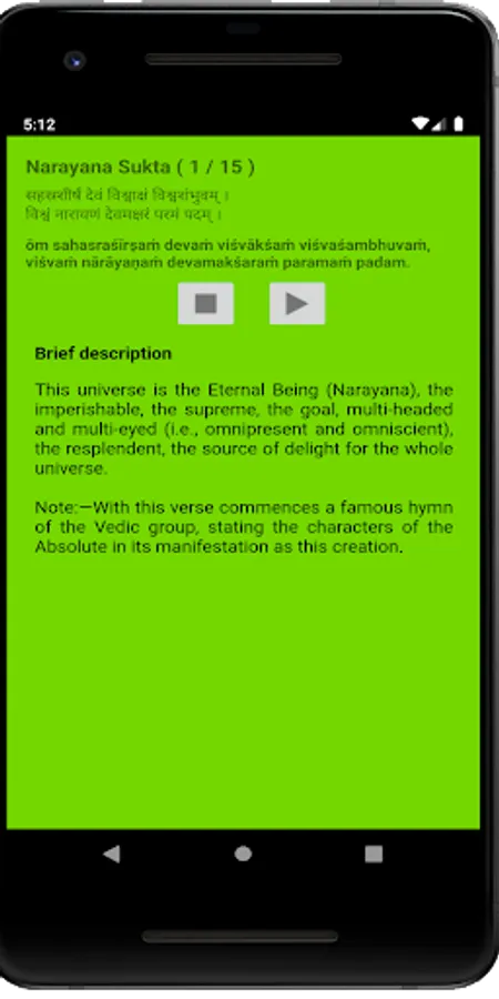 Suktas can be called as the summaries of the vedas, This application tries to explain the meaning of each verse of the Purusha Sukta, Narayana Sukta, Sri Sukta and Durga Sukta. You can easily listen(offline) to the suktas verse by verse and read the meaning along with it.