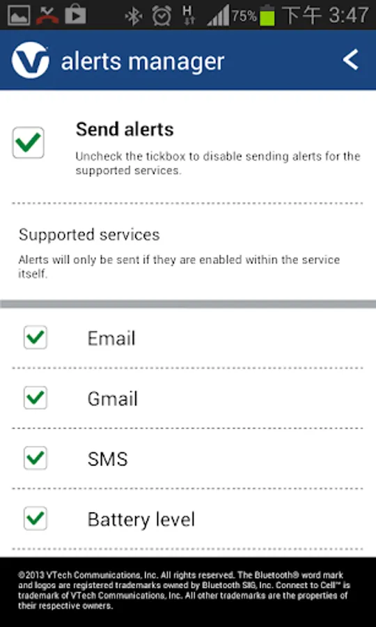 Alerts manager allows you to extend your Android phone’s alerts to your VTech branded telephone system. Your VTech branded telephone will notify you whenever you receive certain e-mails or social media updates on your Android phone, so you will always be kept up to date. Alerts manager is compatible with the following applications or services: