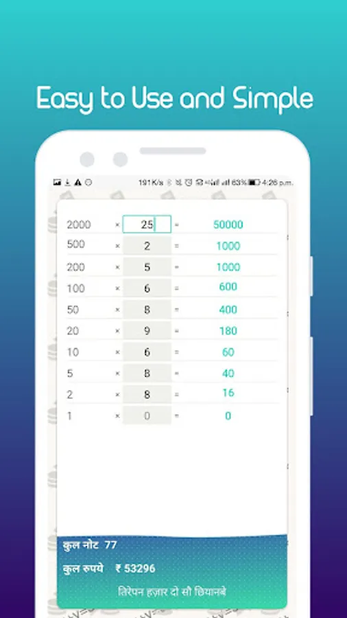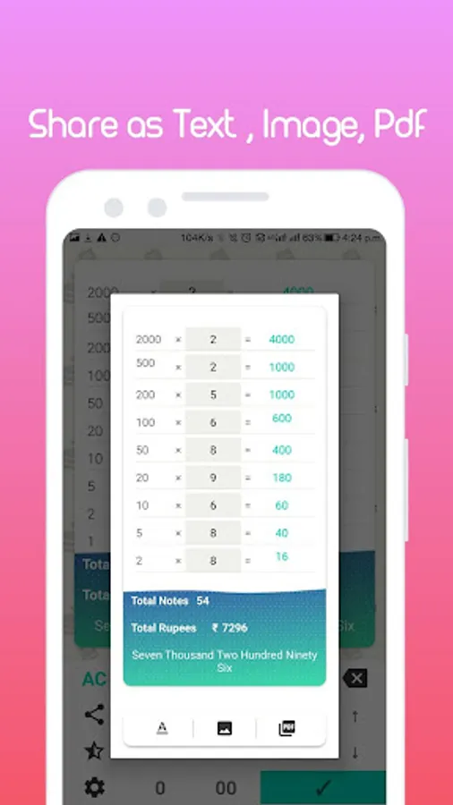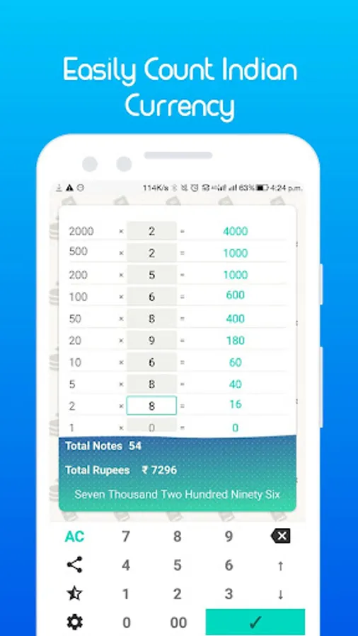 Share counting details to any social media and app. Indian currency denominations Calculator. Get total in words in Indian style in Hindi and English. Cash Calculator for cash counting and saved that file at safe location for further use.