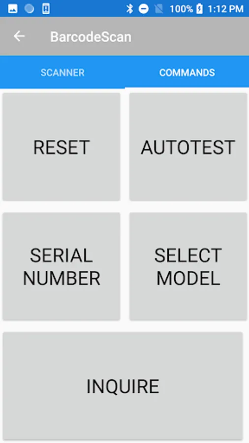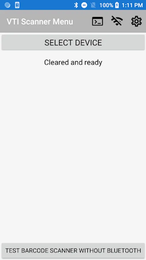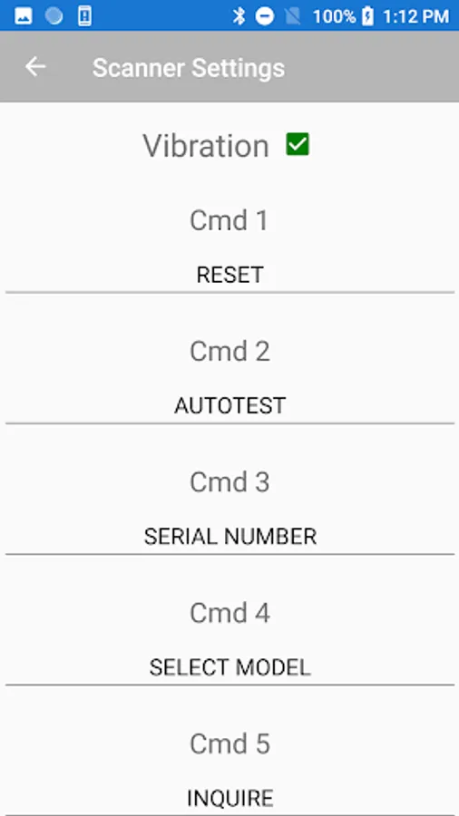 Barcode scanning application using VTI Bluetooth to Serial Adapter to send commands to a device. Can Scan or send user defined commands.