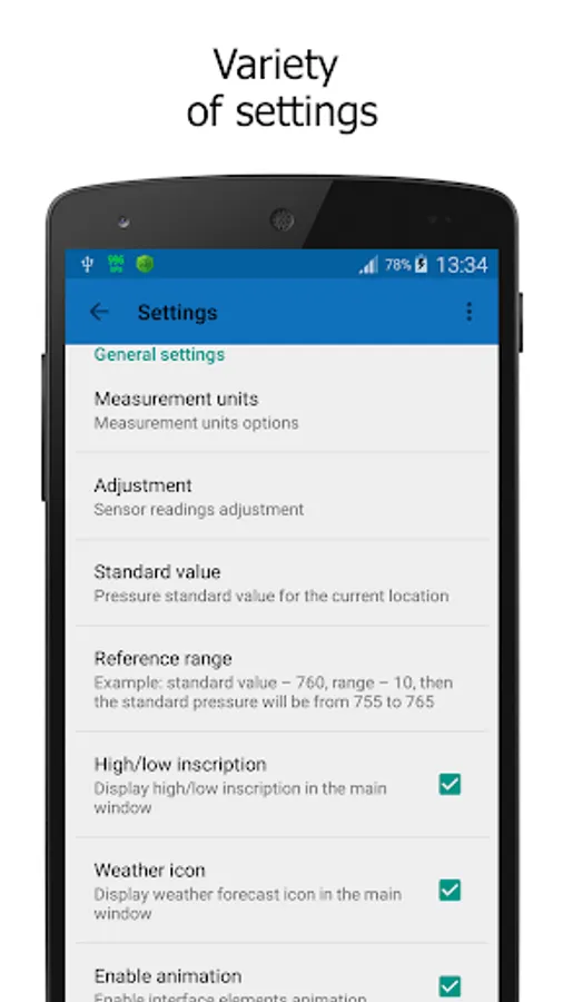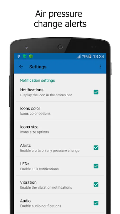The main feature of the application is the air pressure display in the status bar of the device and warning on the pressure change.