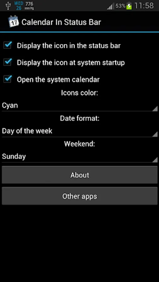 Calendar in status bar – simple app that displays the current date in the status bar in English.