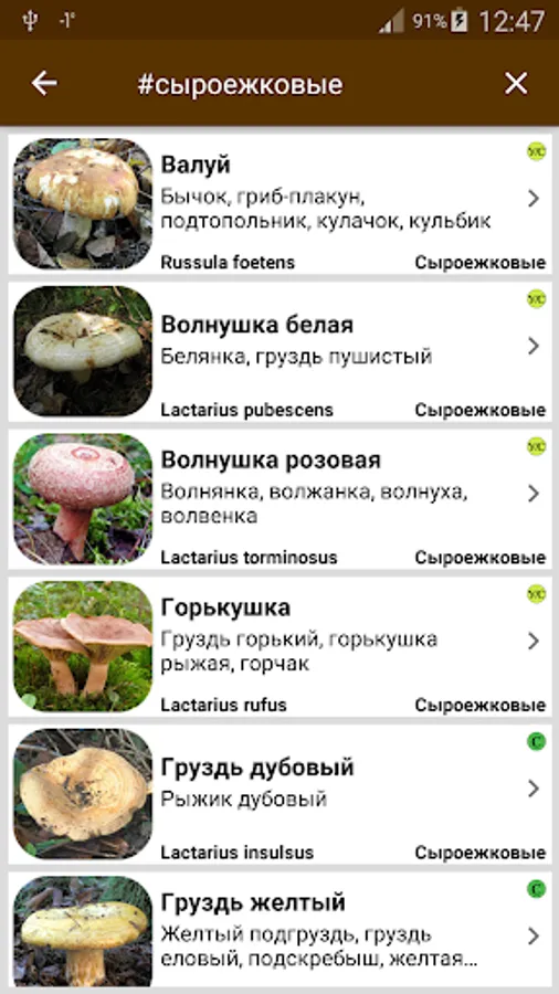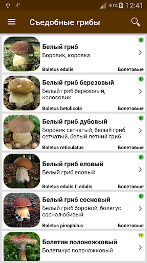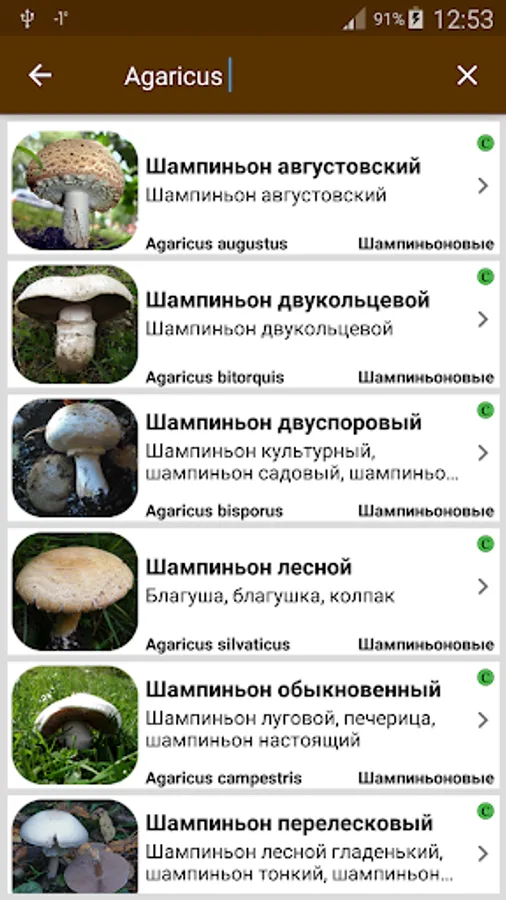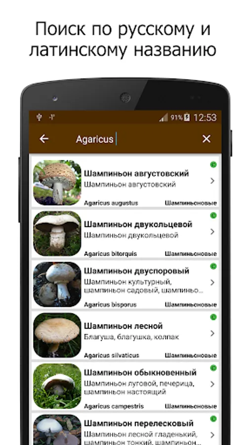 The application supports the search for the name of the fungus in the Russian and Latin languages, as well as a search for the name of the family to which a certain type of mushroom belongs.