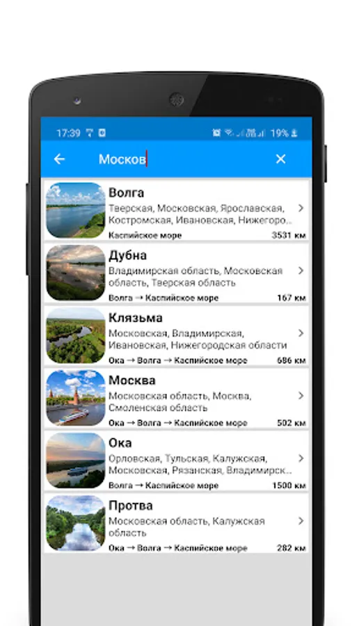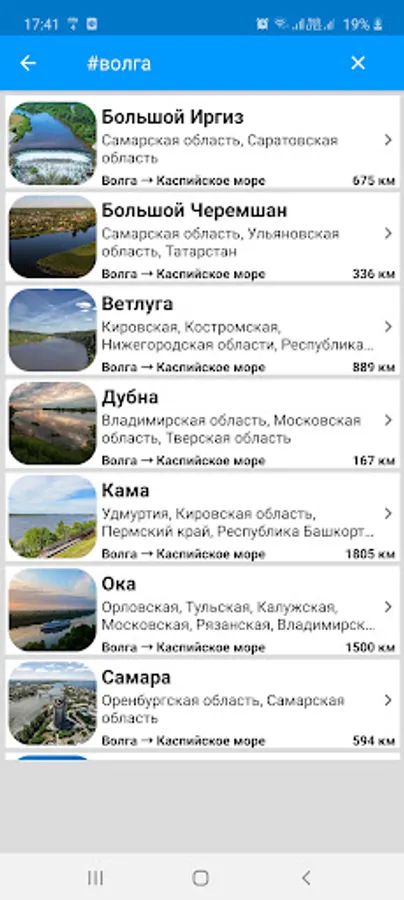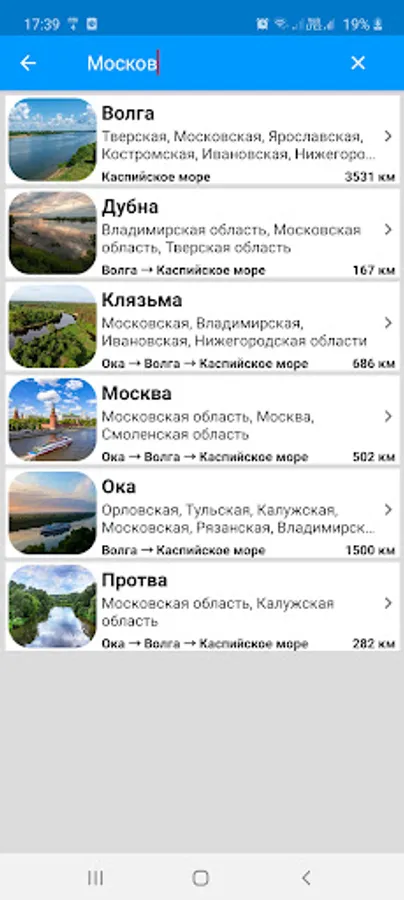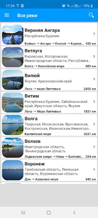 The application supports searching not only by the name of the river, but also by the name of the region.