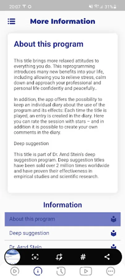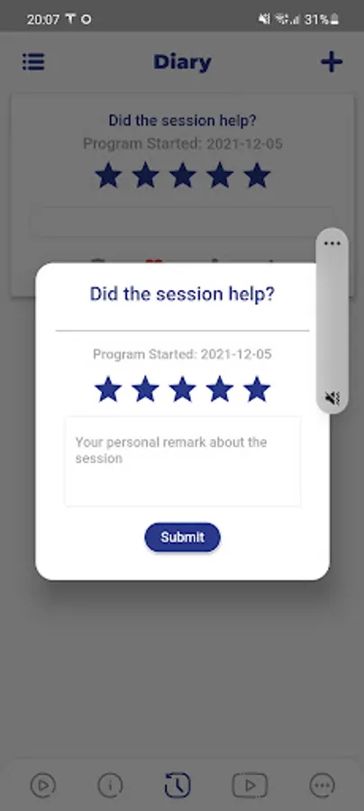 In addition, the app offers the possibility to keep an individual diary about the use of the program and its effects: Each time the title is played, an entry is created in the diary. Here you can rate the session with stars – and in addition it is possible to create your own comments in the diary.