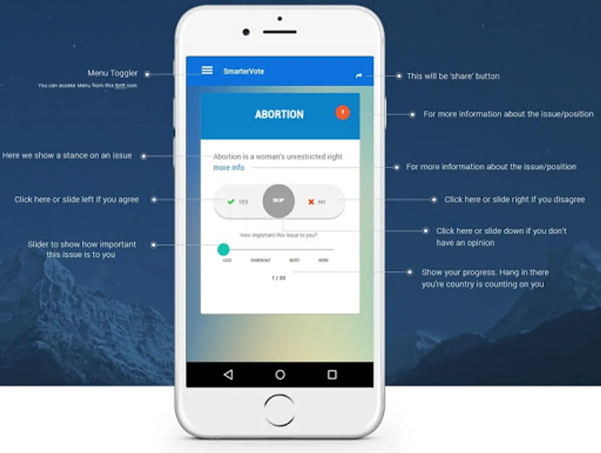 With Smarter Vote, you can test your political views on important social issues and choose which Presidential candidate to vote for in the 2016 US Elections.
