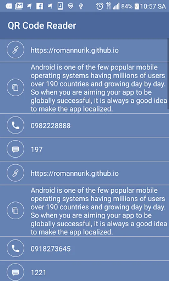 To scan the QR Code, simply open the application, align the code. QR Code Reader will automatically recognize any QR Code. When scanning the QR Code, if the code contains a URL, you can open browser to the site by press browser button . If the code contains only text, you can instantly see.