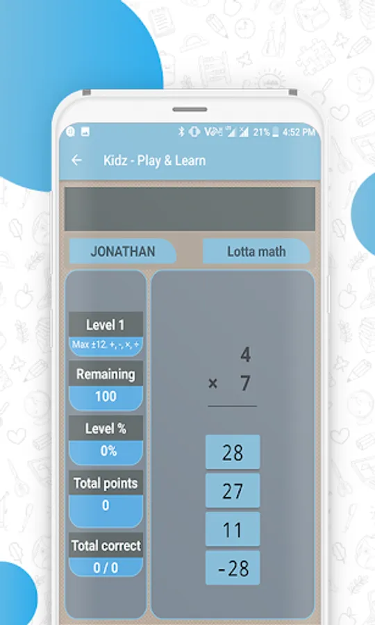Lotta Math levels mix the various arithmetic operations and uses negative and positive values in operations like add, substract, multiply or divide.