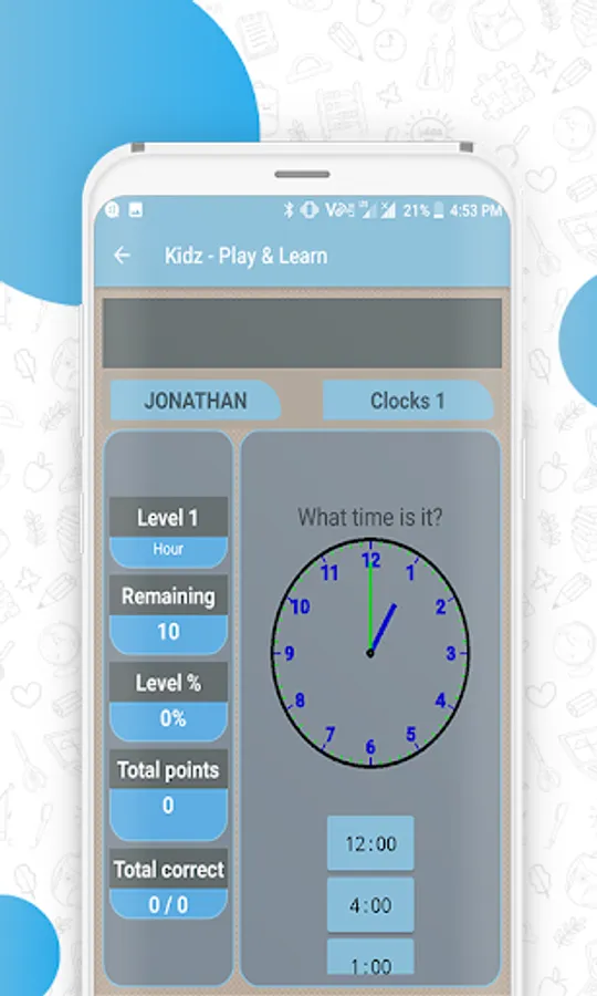 Knowing the time from clock is also as important as learning maths or spellings. Many levels and sections of this are added in Kidz - Play & Learn app. Time will be shown on clock and kids need to choose the correct displayed time from multiple choces.