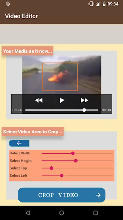 In Crop video you can choose the video area you want to crop. In crop the duration of video would be the same but the video will be just of selected crop area, like in any video you dont want to have those unwanted persons or sections, then just select the video area which you want to include and leave other section behind.