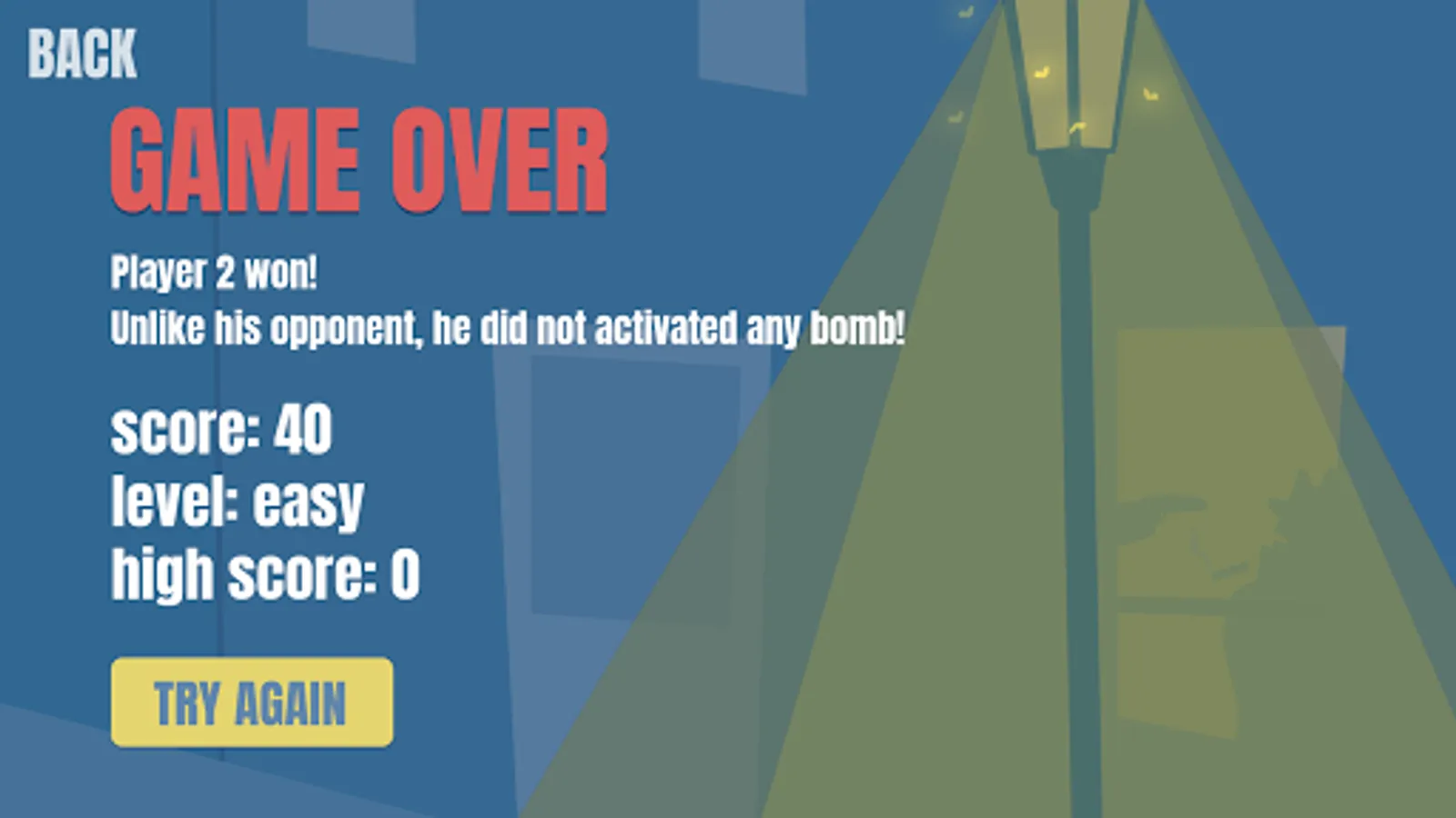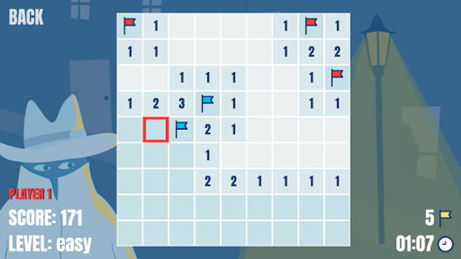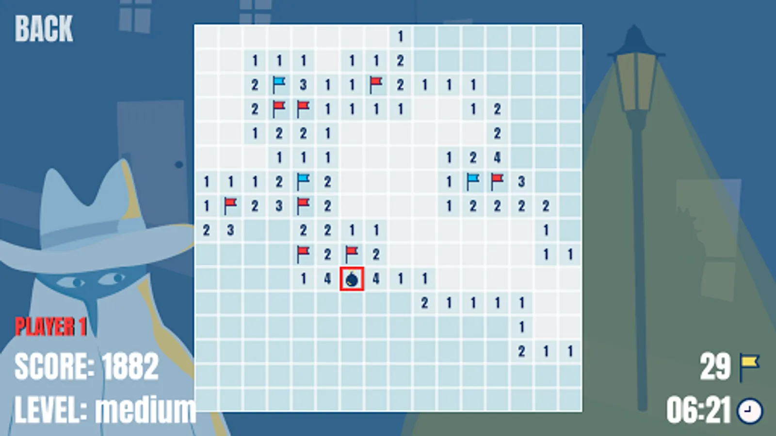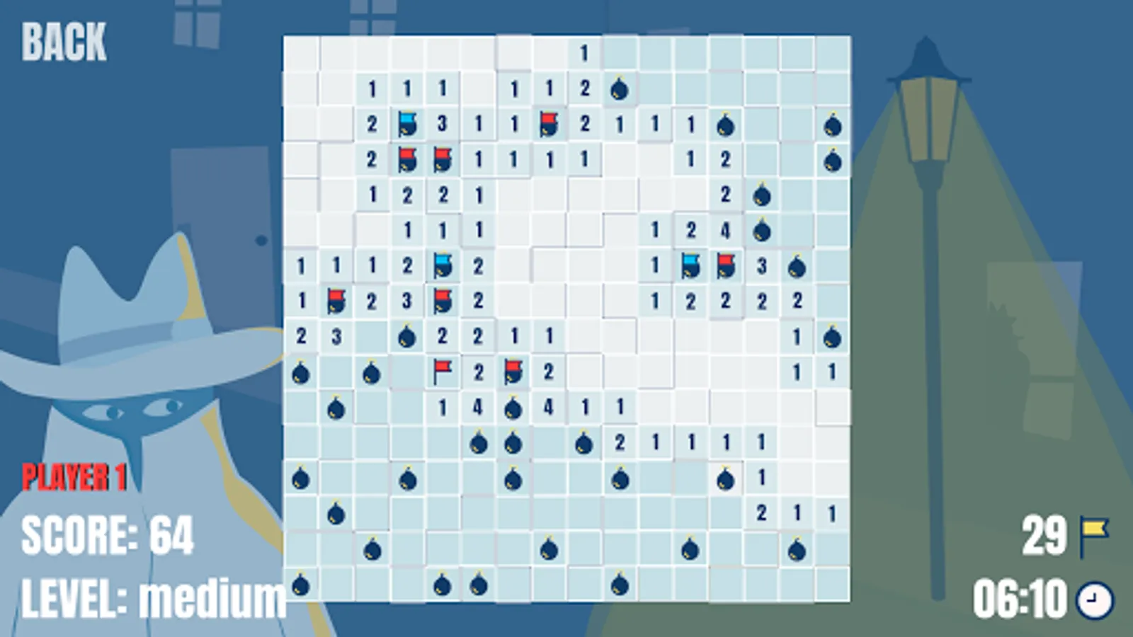 The objective of this game is clearing the rectangular tiles board containing hidden bombs without detonating any of them. The player selects one field at a time, which reveals the total number of neighboring mines. He should carefully put a flag in every field for which he is sure there is a bomb. The game is completed when all of the bombs are flagged and every other field is opened.