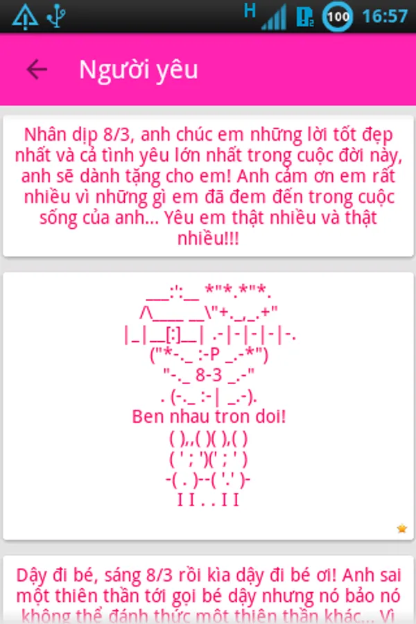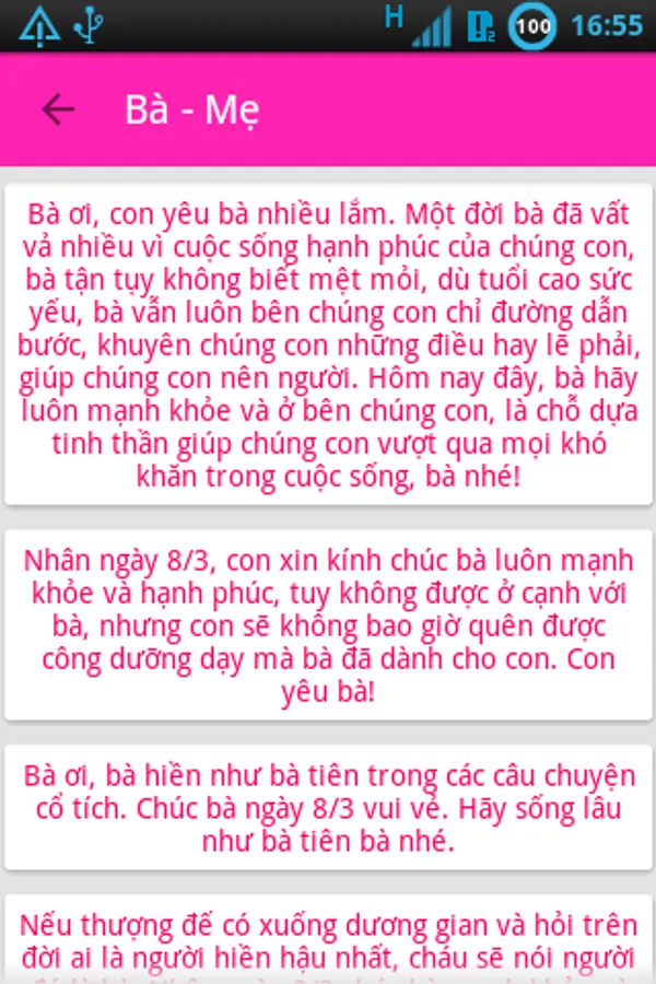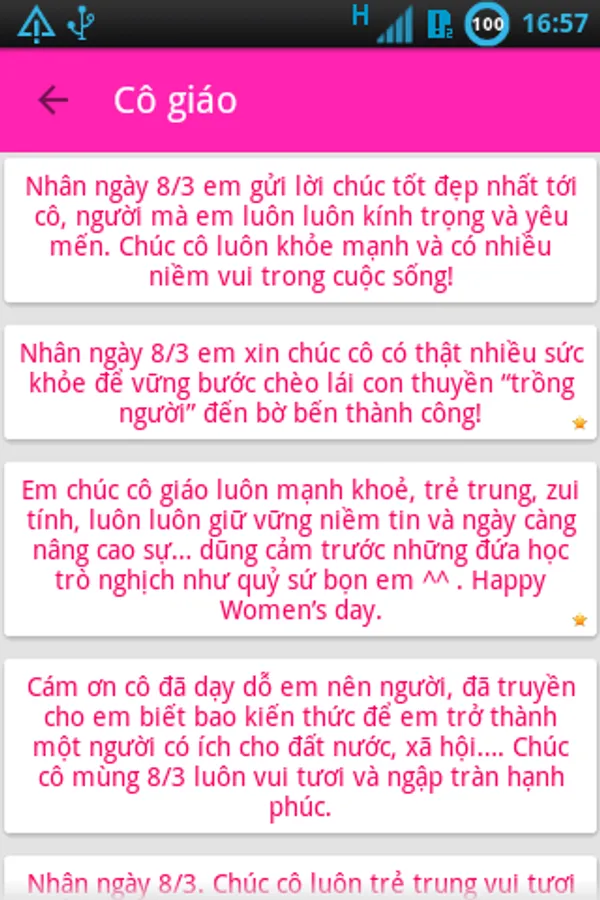 International Women's Day is the day for you to send good wishes to the women, the mothers, sisters, girls, and greetings to the teacher. 8-3 Good Word application has collected more wishes or, meaning, character messages, greetings in English makes it easy to choose and you can send an SMS message or share via Skype, Facebook, Zalo, Viber, Mocha, ..