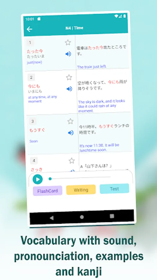 1. Listen to a single vocabulary, listen to examples. Not only are you learning vocabulary, but also you can imitate Japanese pronunciation. Please experience learning vocabulary and listening practice with the app