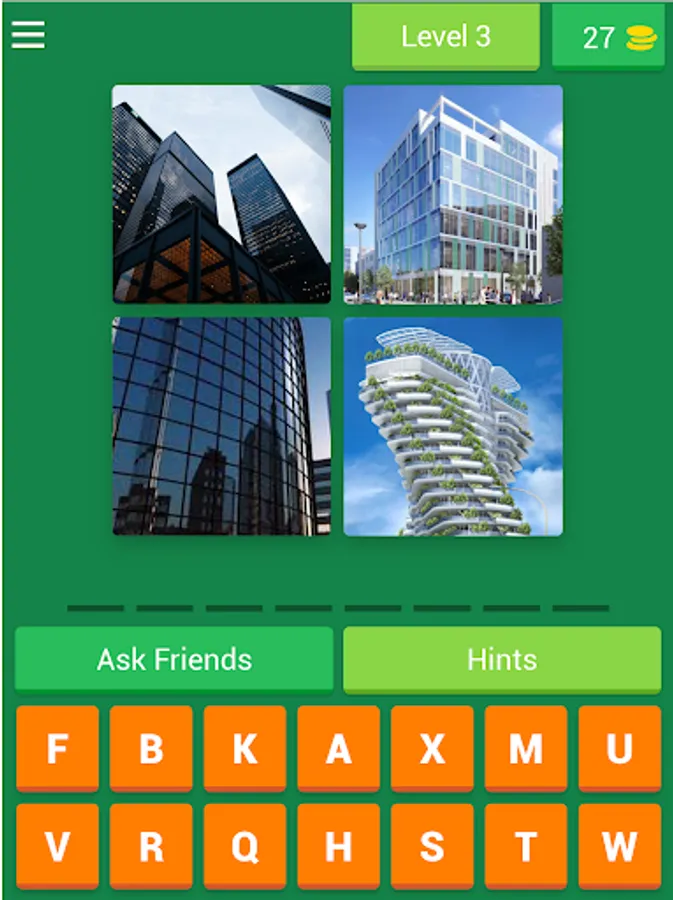 4 Pictures 1 Word game. You have 4 images and you have to guess the word based on those images. If you a person who likes to travel a lot and enjoy different cities and countries, than you can consider this app as a travel quiz also. There will be a lot of questions about different cultures, traditions and unique sightseeings. Biology and animals are also present as a topic in the quiz together with some other sciences. You will be amazed how sometimes only a fragment of an image can mislead you to a wrong clue or idea. Sometimes when you recognize the right detail, you will be solving levels in a flash. Remember, if you get stuck, you can always use a rewarded video as a help option or you can just simply ask a friend via social network option, it is up to you.