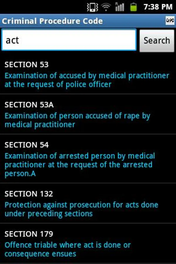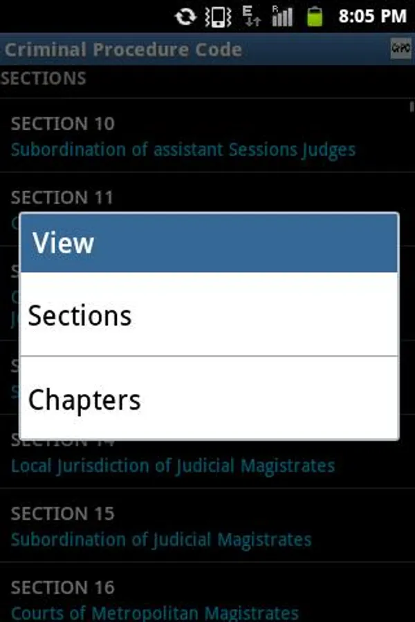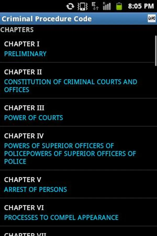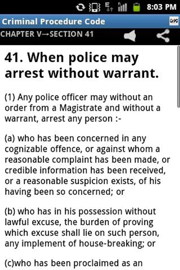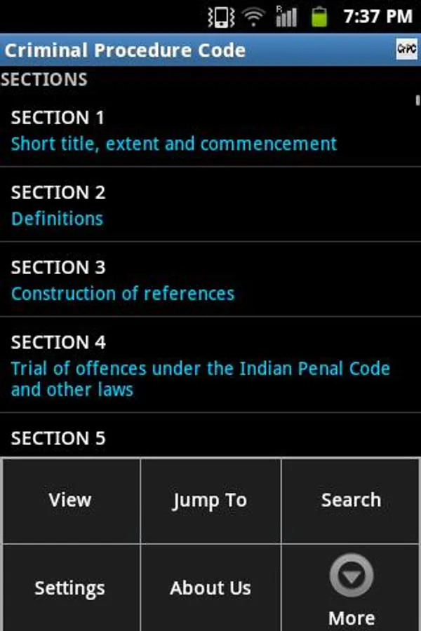The Code of Criminal Procedure (CrPC), 1973 with latest amendments - FREE APP with a simple, easy to UI organized as Chapters and Sections and having a powerful set of features including freetext search, text to speech, jump-to, theming, customizable settings, sharing (facebook, gmail, twitter etc.)
