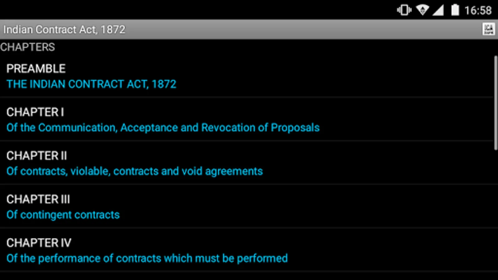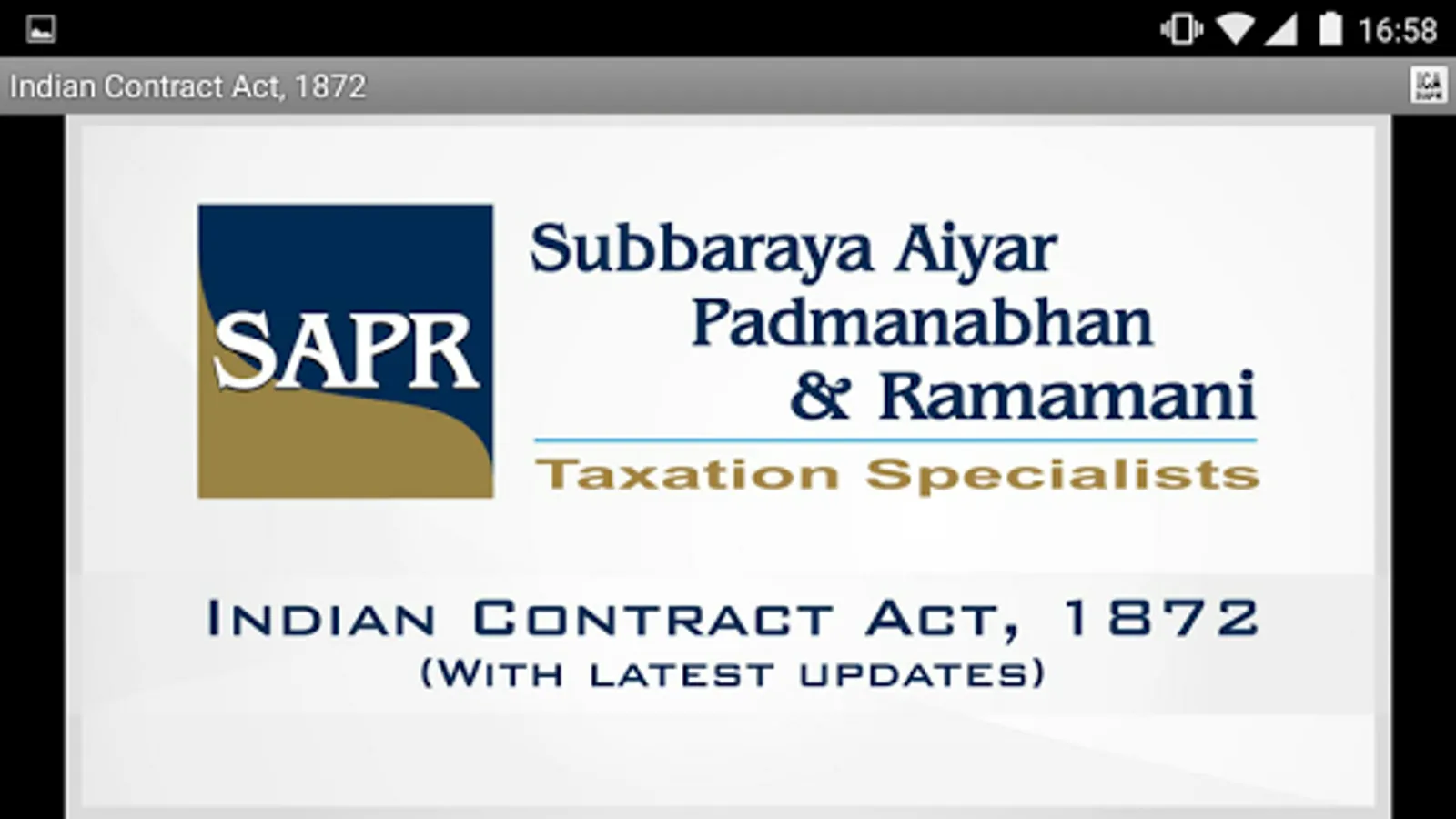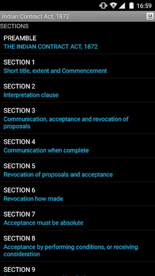 A fully functional, uptodate and FREE application featuring the Indian Contract Act, 1872 with latest amendments. This application, among many other features, has powerful search functionality and an intuitive user interface.