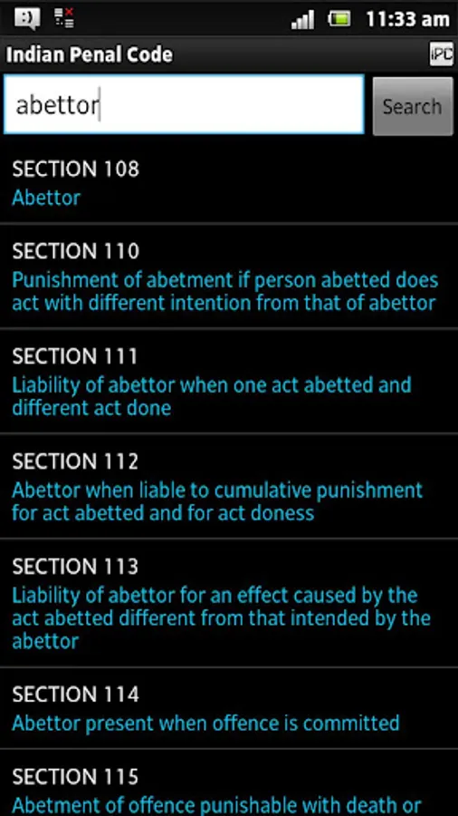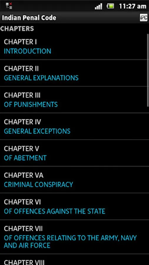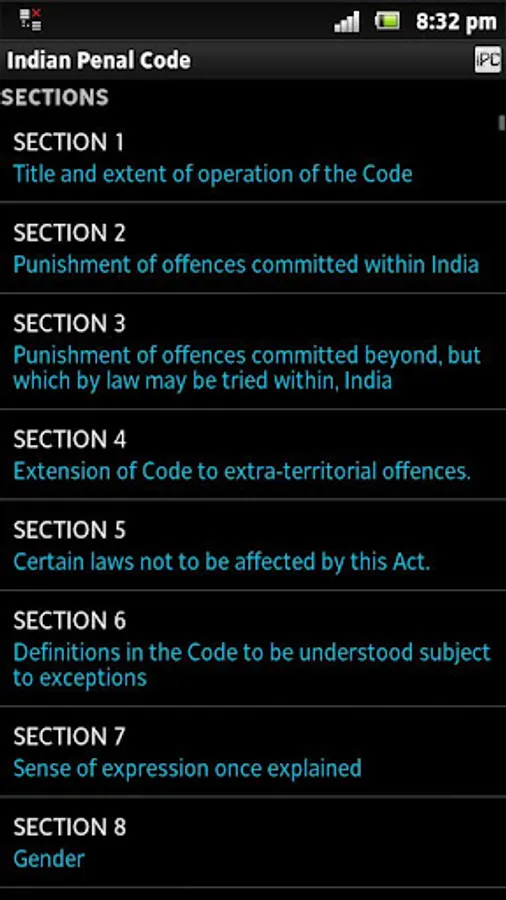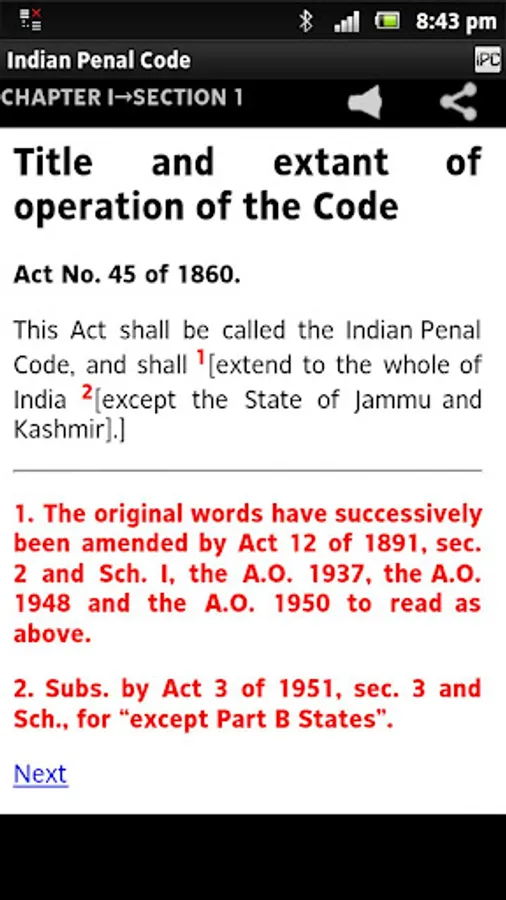 Indian Penal Code (IPC), 1860 Act with latest amendments - FREE APP with a simple, easy to UI organized as Chapters and Sections and having a powerful set of features including freetext search, text to speech, jump-to, theming, customizable settings, sharing (facebook, gmail, twitter etc.)