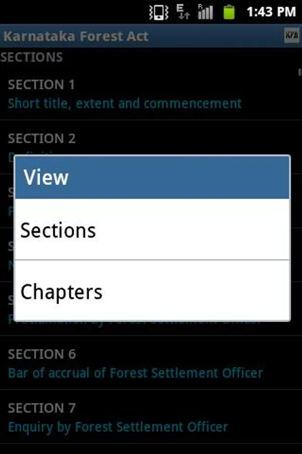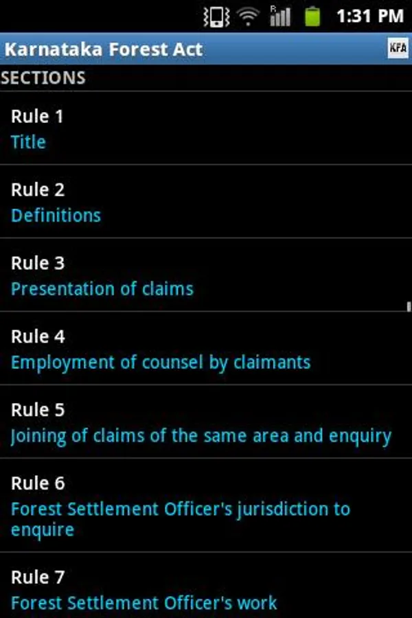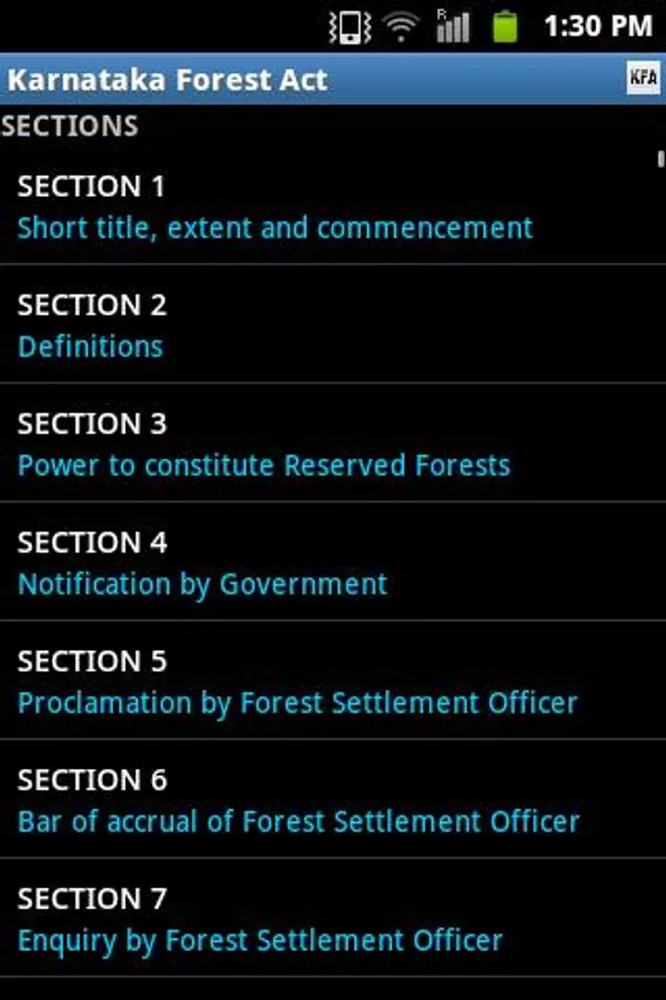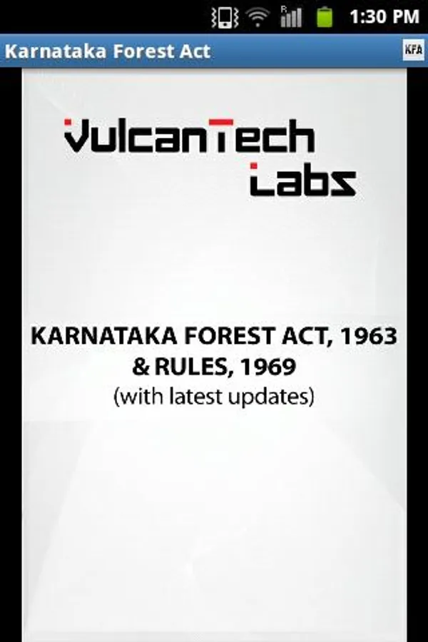 Karnataka Forest Act (KFA), 1963 and Karnataka Forest Rules, 1969 (with latest updates) in a single android app with powerful features including freetext Search, Jump to Sections, theming etc. We hope this FREE app serves as an useful tool aiding the conservation of forest and wildlife.