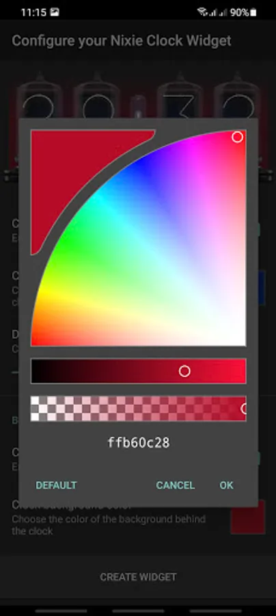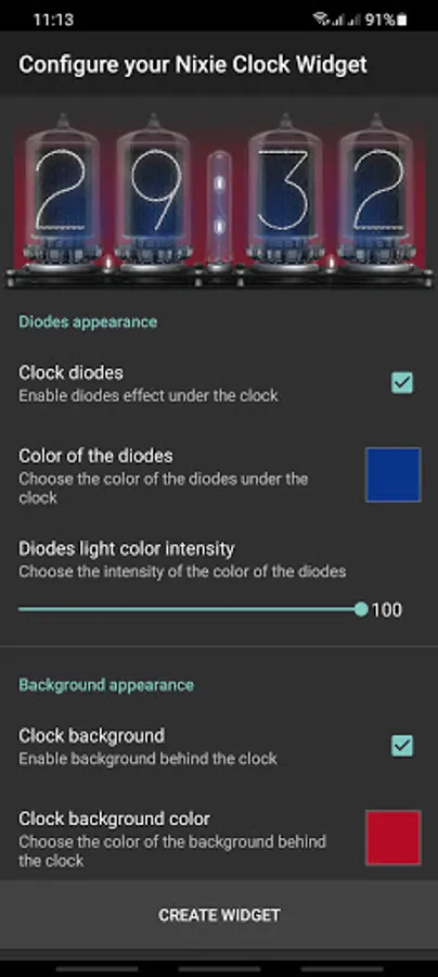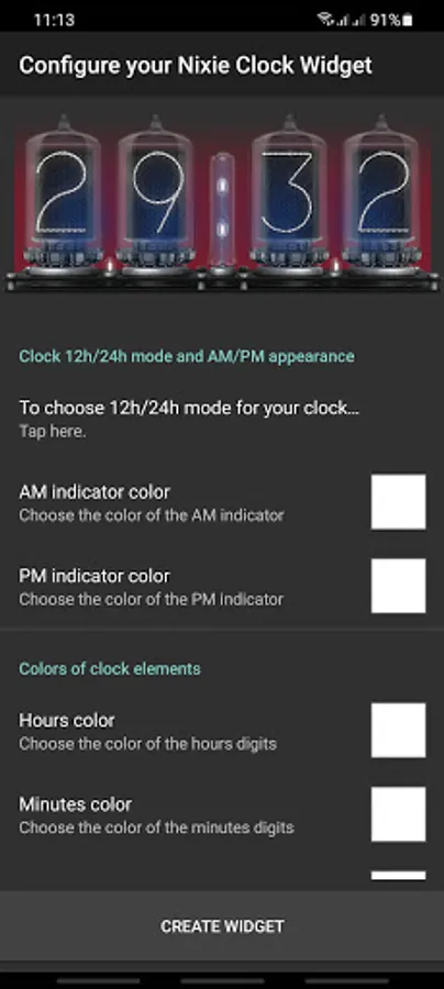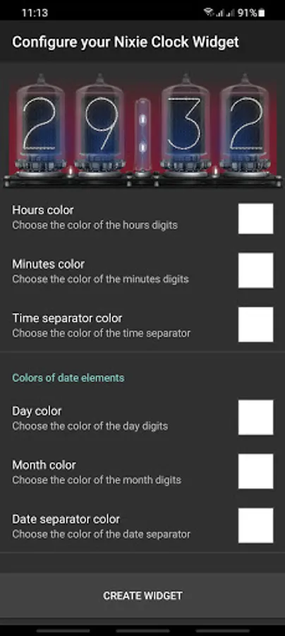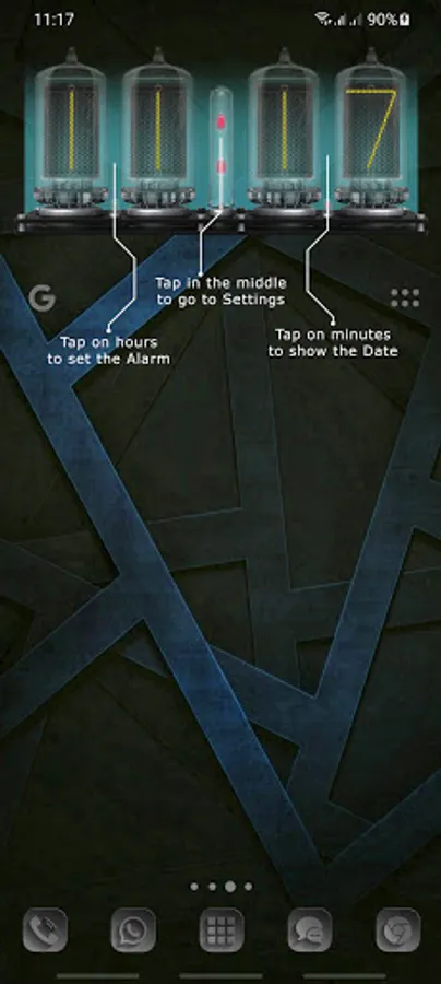 Nixie Tube Clock Widget displays current time/date and helps set up an alarm.