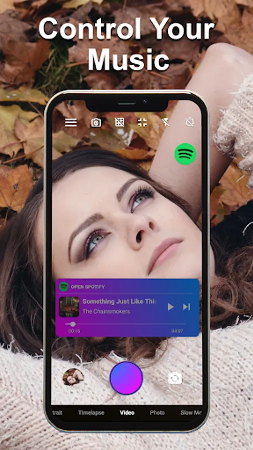 The video editor with music supports a wide range of audio formats, and you can easily control the music playback directly within the camera interface. Pause, resume, skip, shuffle, and change tracks on the go, ensuring your videos are set to the perfect soundtrack.