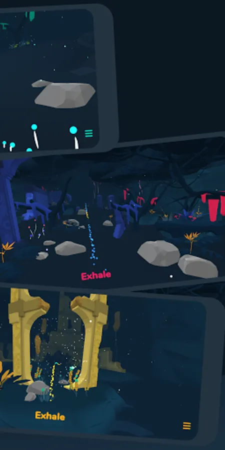 In Flowborne, your breath is embedded in soothing virtual worlds based on psychological principles of restoration and recovery. Balanced and calming color schemes combined with fascinating effects and a relaxing meditative soundtrack gently draw your involuntary attention and allow your mind to focus entirely on your breath. This helps replenish depleted mental resources in a casual way.