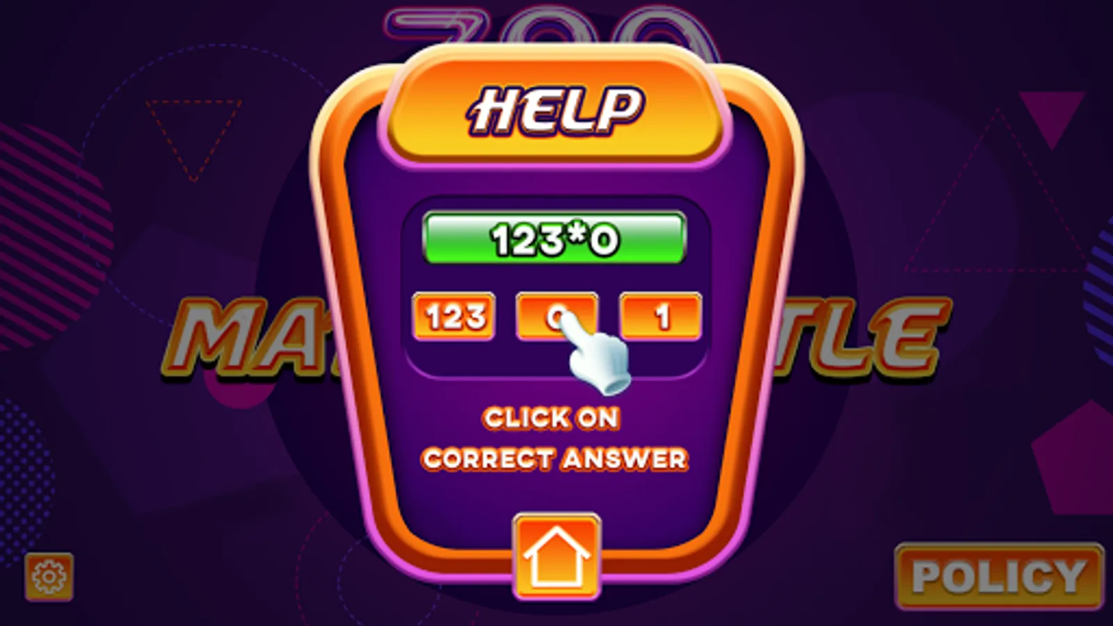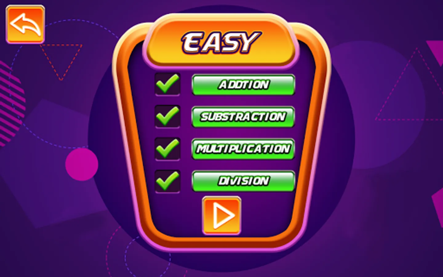 Settings on/off option for addition, subtraction, multiplication, division.