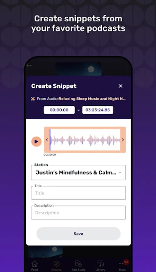 Clip what you love from any audio to share. You can create snippets of your favorite bits from podcasts, stories, concerts or random audio files on Vurbl!