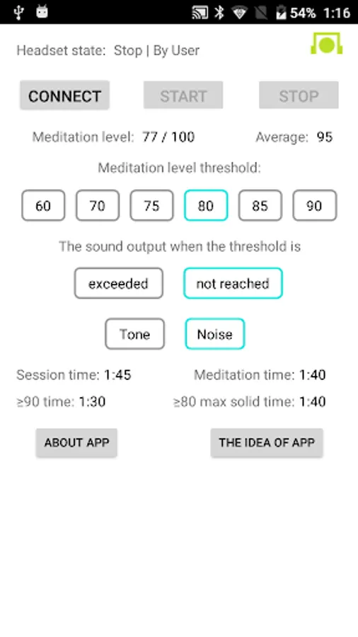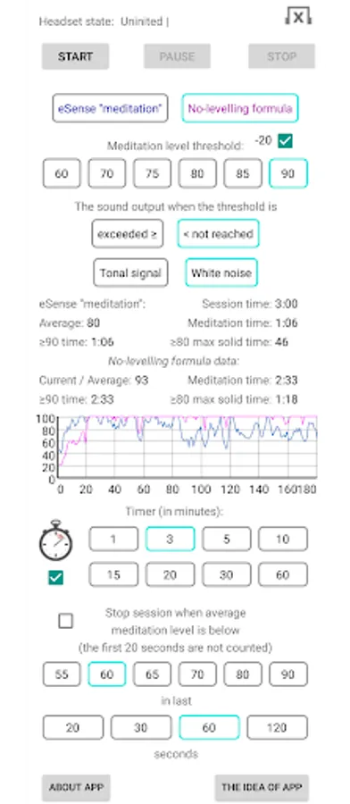App makes a sound signal whenever the selected by user meditation level threshold is exceeded or not reached, according to your choice. Also you can select a tone or white noise. This sound signal allows you to control your meditation (with closed eyes, or the opened ones), and in 1-2 seconds to know, that you are out of meditation. Also, when the level of your meditation exceeds your chosen threshold, a colored bar appears at the bottom of the screen. The application remembers user settings on the next launch.