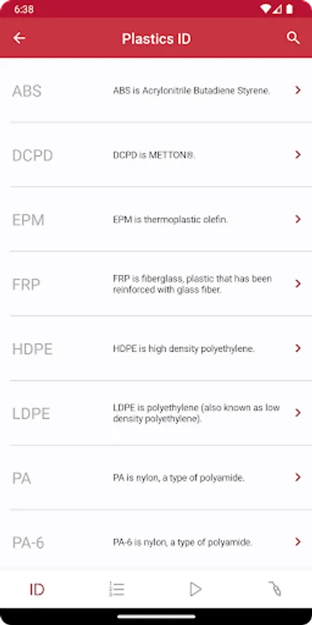 The "Plastics Identification" section lists out the most common plastic identification symbols and details what they are, where they are found, and how to repair them. This section has a search function to allow you to more easily identify the plastic you are working with.