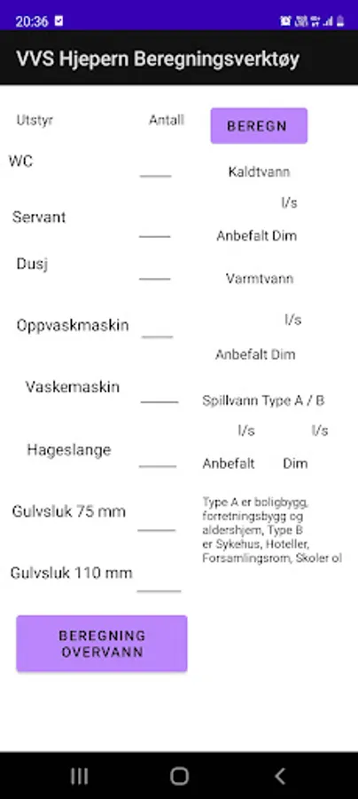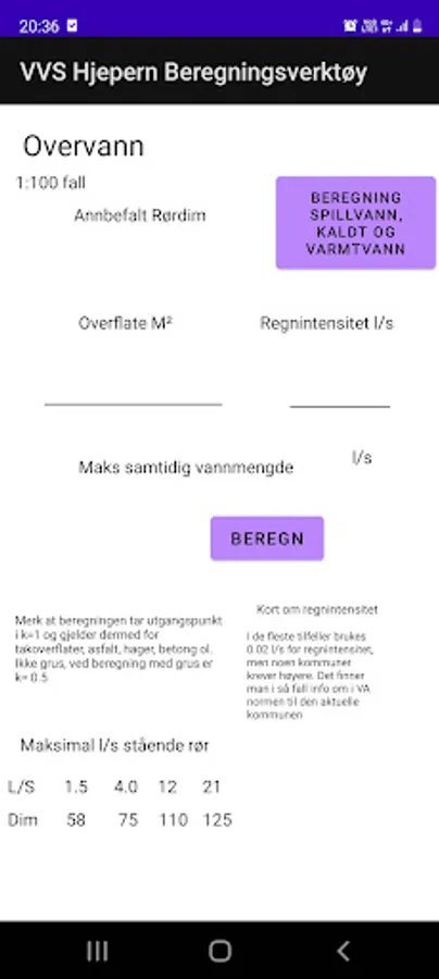 The app allows you to easily find the required dimension of piping for surface water, drainage / wastewater, cold water and hot water. Works well to check if you, for example, have a large enough dimension for a conversion.
