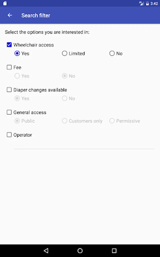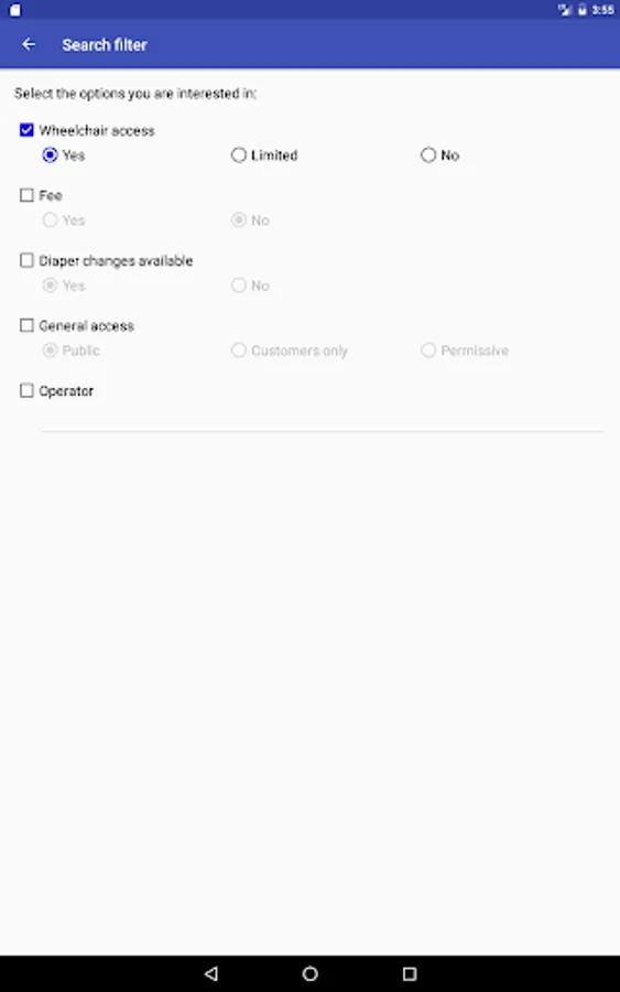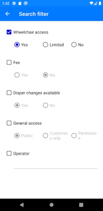 - The toilet search can be limited to certain features like e.g. wheelchair accessibility.