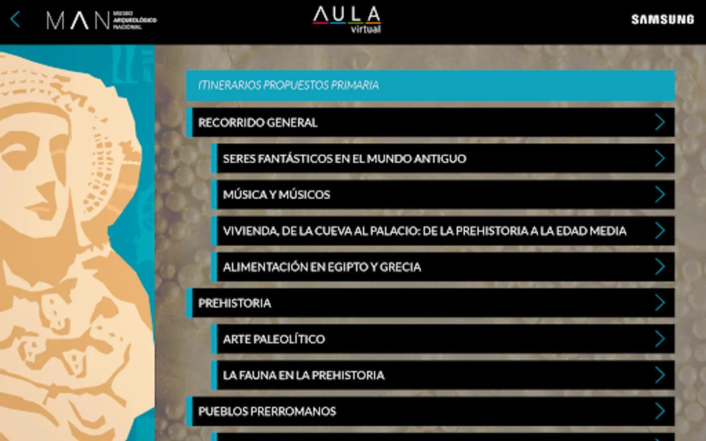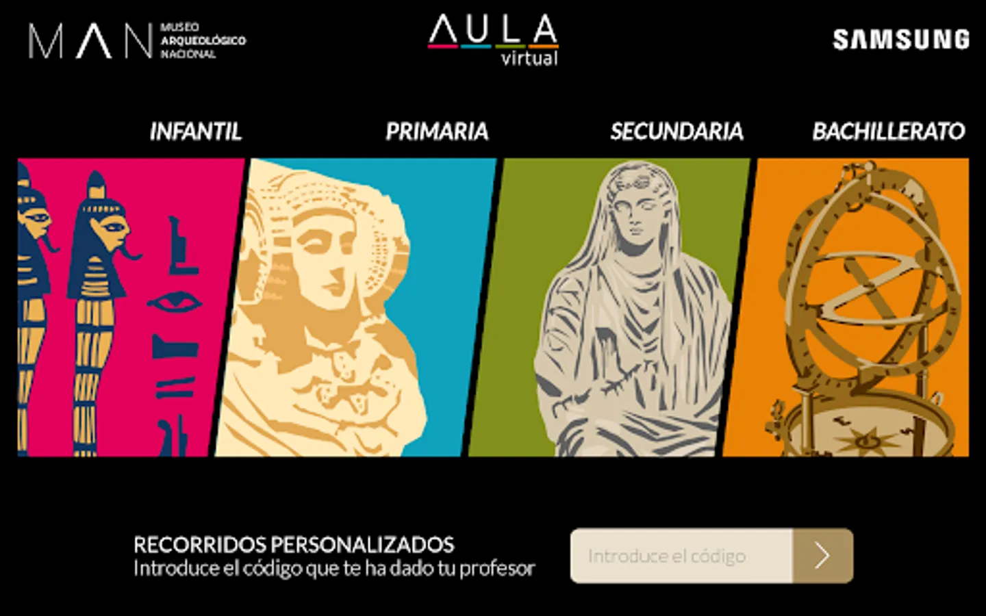 We welcome you to the Virtual Classroom of the National Archaeological Museum, a tool that will allow you to discover thematic routes created by MAN, classified by curricular level, as well as view specific routes created by your tutor.