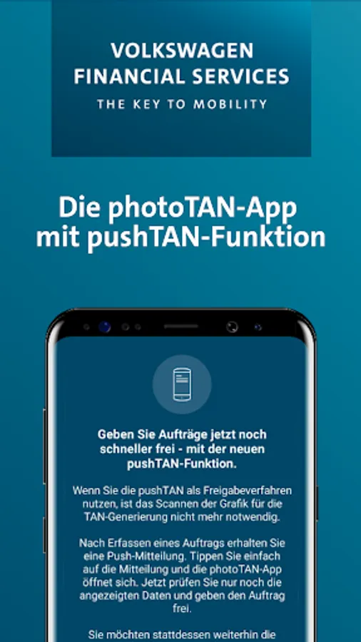 If you installed the photoTAN App and the VWFS AG Banking App you can do your banking business by our App2App Service.