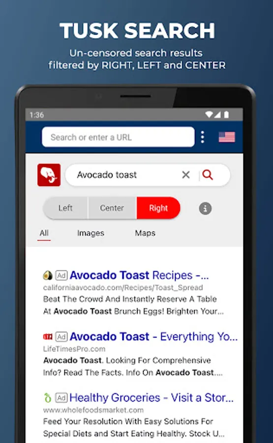 With TUSK’s built-in Search Engine and News Feed, you can easily access all the articles from popular media organizations that you trust, such as, Fox News, New York Post, Newsmax, OANN, The Daily Wire, Breitbart, and many others. No more buried stories or media censorship! TUSK Search features easy-to-use RIGHT, LEFT and CENTER buttons so you can filter the organic search results easily. Missing your favorite news source? Easily customize the relevant news publishers you want to see in the TUSK News Feed and on your homepage, this way you have 100% control. No other news feed has built-in predictive AI to show you the articles that everyone is engaged with right now, as well as the breaking stories that will matter most in the hours and minutes ahead. TUSK remains committed to giving you the clarity and insight that no other search and news source can.
