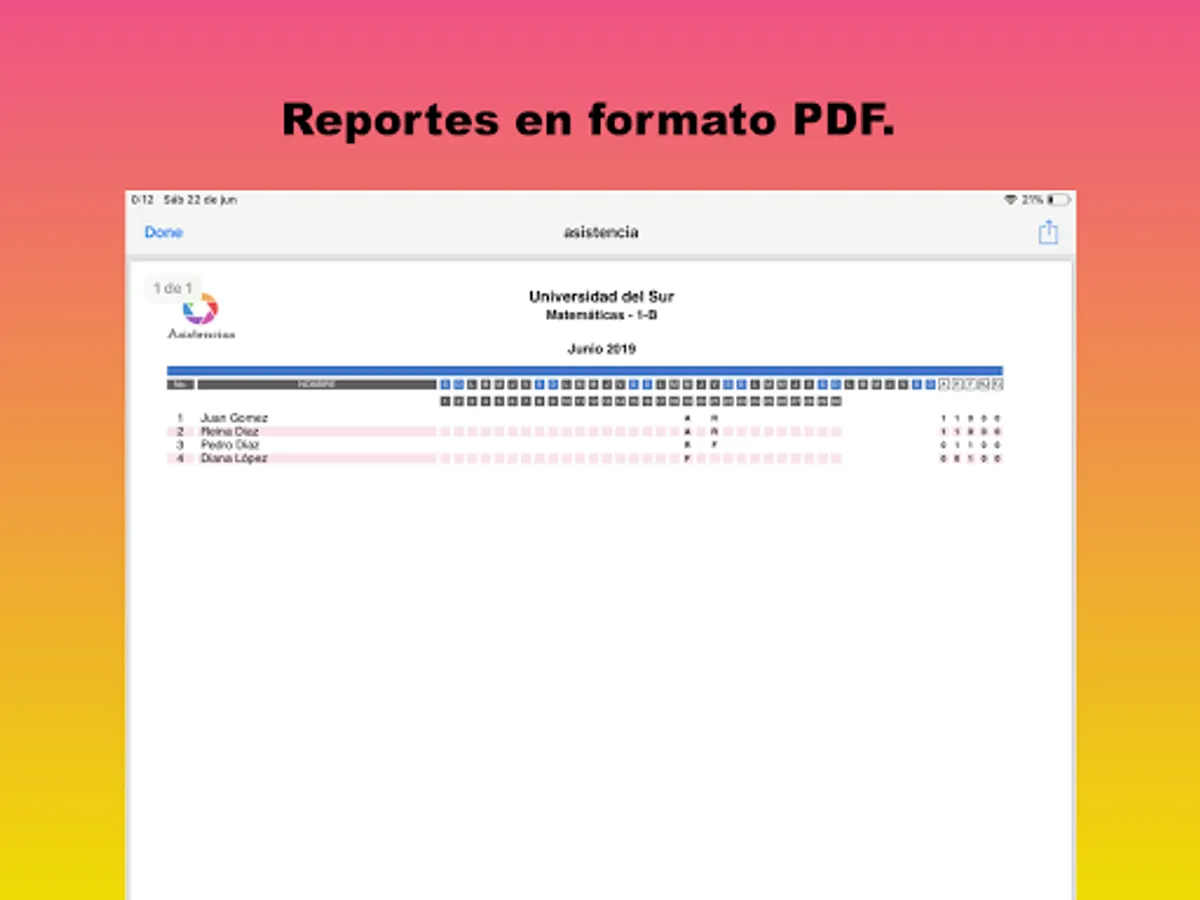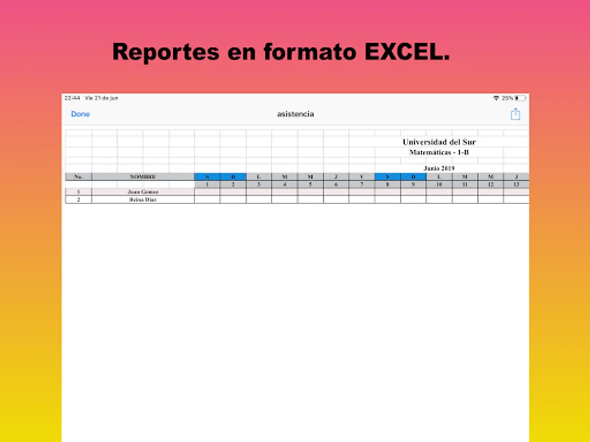 - Generates reports in PDF and EXCEL format (List of Students, General Attendance, Detailed Attendance with Note, Absences).