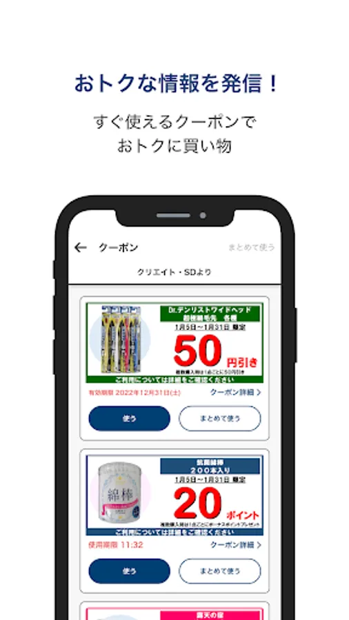 You can use two types of "special coupons" that can be used immediately at the store, and "point coupons" that do not need to be presented at the cash register just by checking before shopping.