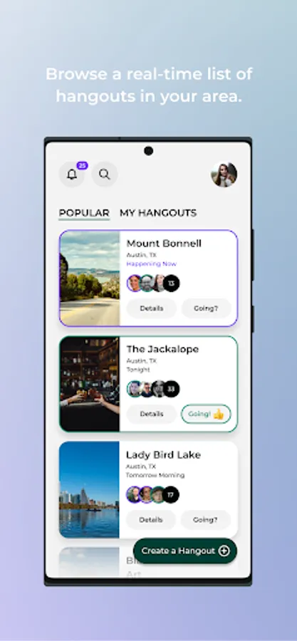 Browse a real-time list of hangouts in your area.