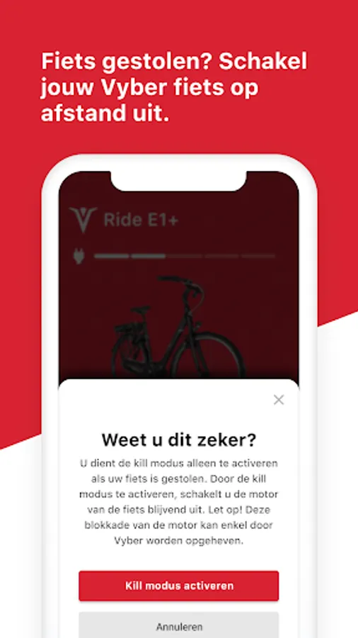 Cycling becomes a lot more fun with Vyber Connected Ride®! With our unique App you can quickly find your SmartBike or check the status of the battery. You can even switch off your SmartBike remotely if it is stolen.