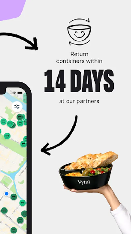 With the Vytal app you can get food and drinks without packaging waste and without a guilty conscience. In the app you will find all participating restaurants, canteens, universities, etc. where you can get your take-away in our sustainable Vytals and return it after consumption.