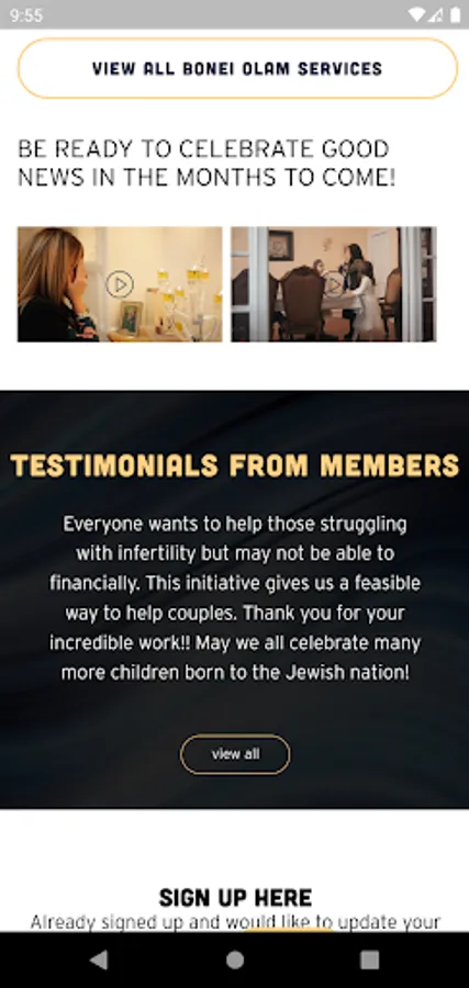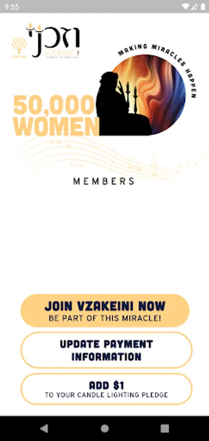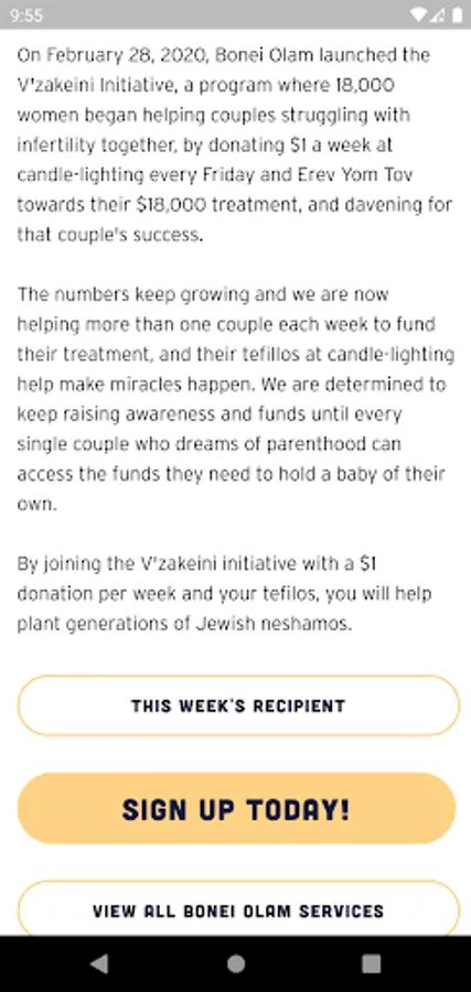 On February 28, 2020, Bonei Olam initiated the V'zakeini Program. 25,000 women participate by donating $1 weekly during candle-lighting on Fridays and Erev Yom Tov. The funds go towards infertility treatments for struggling couples, and the women pray for their success. The Vzakeini app offers members access to tehillim names and candle-lighting zmanim.