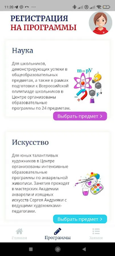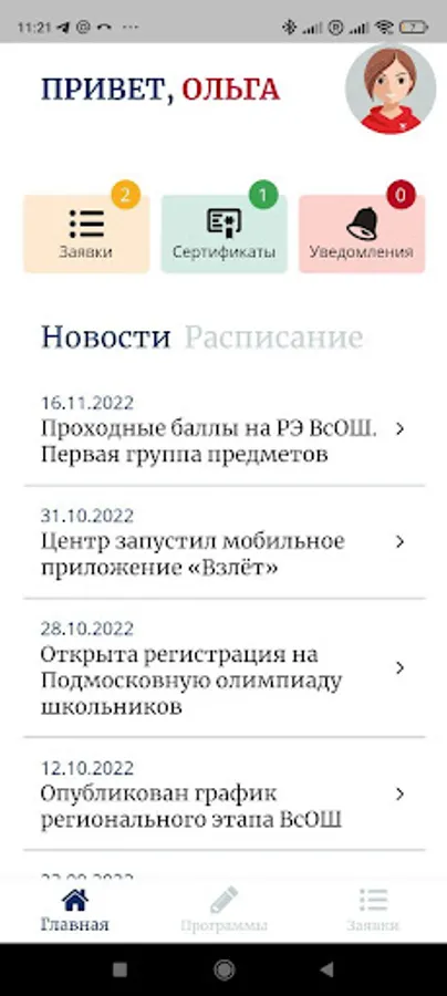 Using the application, you can track free educational programs in the areas of "Science", "Art", "Sport", apply, and be the first to know news about current olympiads and competitions.